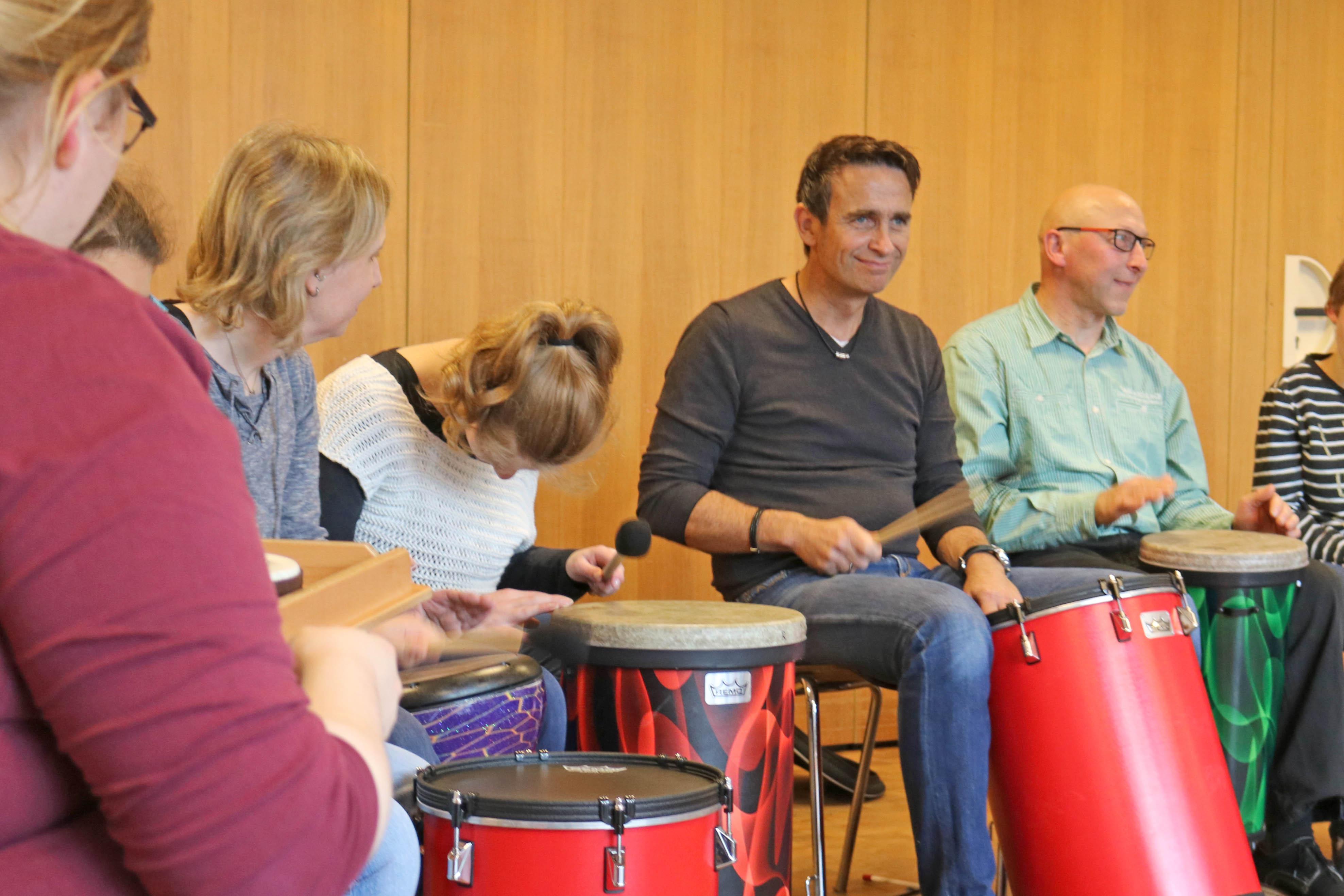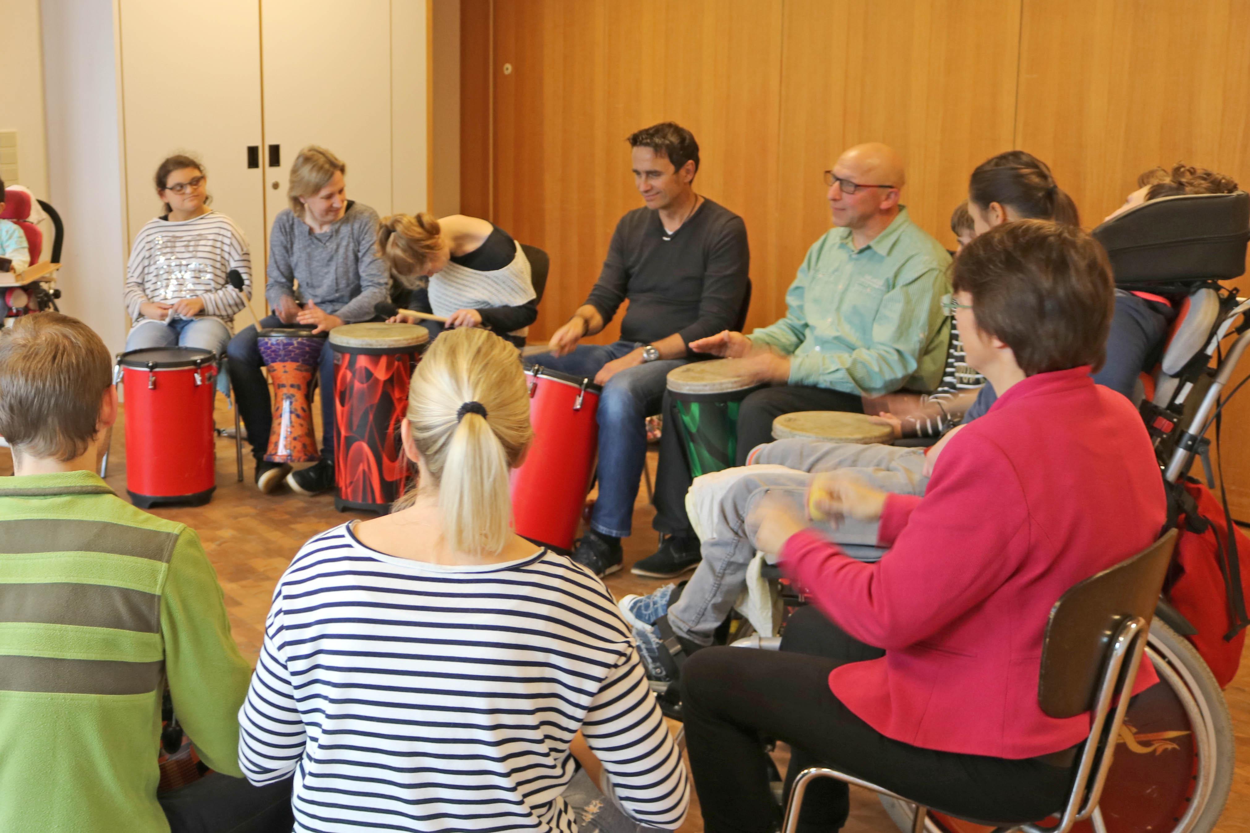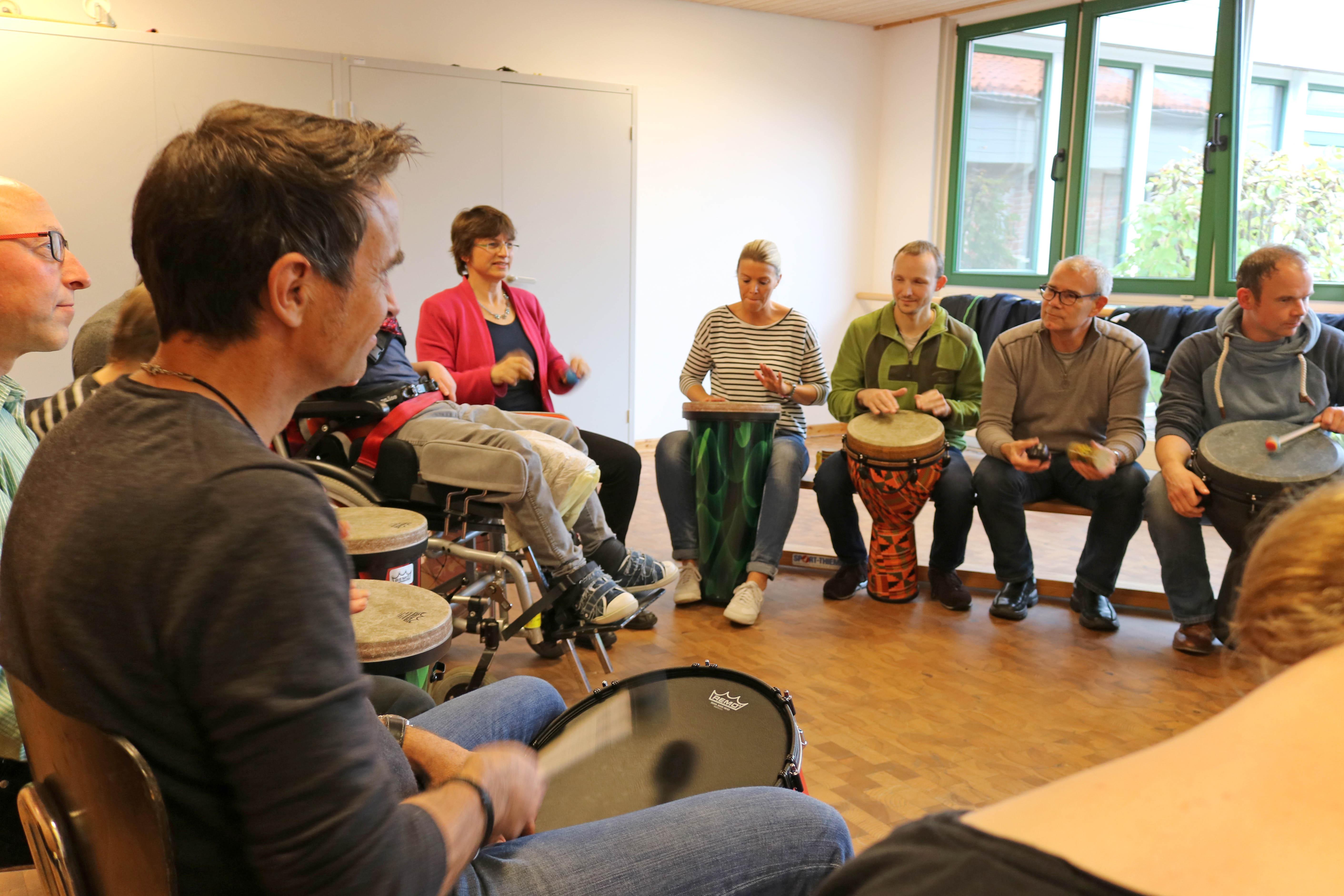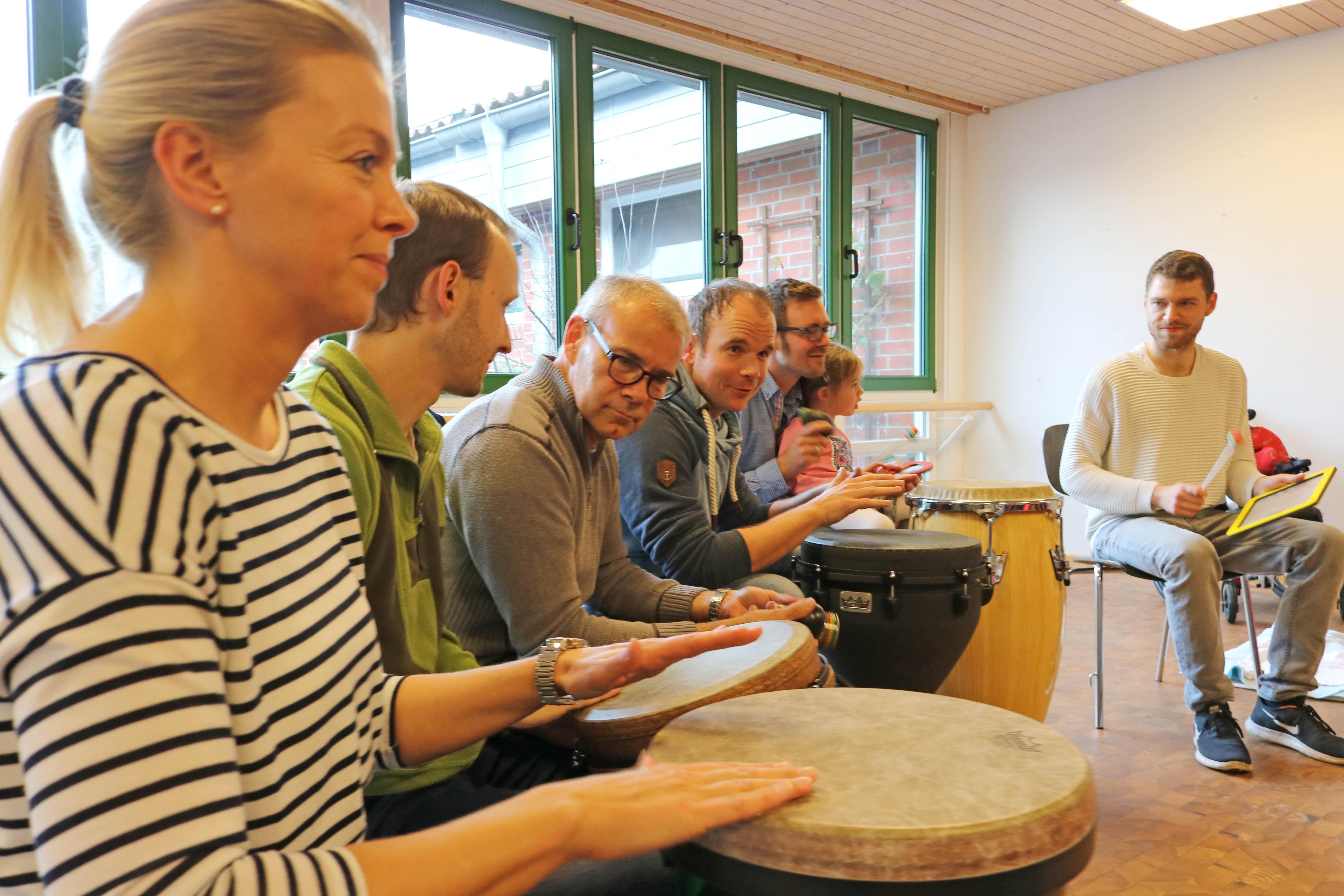 Oldenburg, 03.11.2017 - Sonst sind sie Stahlbauschlosser, Programmierer, Fertigungsleiter, arbeiten im Büro oder an riesigen Maschinen. Heute sind sie zusammen mit ihrem Chef, Dirk Schade, von Wildeshausen nach Oldenburg gekommen, um den Regenbogenkindern eine Spende zu überbringen: 3000 Euro haben Sie im Gepäck. Davon sollen Spielgeräte für die Kinder und Jugendlichen mit Behinderungen gekauft werden und Trommelworkshops organisiert werden. Denn Einrichtungsleiterin Ute Dorczok hatte Dirk Schade berichtet, dass viele Kinder und Jugendliche sehr empfänglich für die Rhythmen und Klänge von Percussion-Instrumenten sind. Unter der Anleitung von Pop-Kantor Steffen Schöps verwandelte sich die Spendenübergabe zur großen Freude der Kinder aus Haus Regenbogen in einen unüberhörbaren Trommelnachmittag. Zum sonoren Klang der tiefen Trommeln spielten die Teilnehmer auf Bongos, Rasseln und anderen Percussioninstrumenten. So haben Dirk Schade und seine Mitarbeiter selbst gesehen, wie Ihre Weihnachtsspende im Haus Regenbogen verwendet wird.
