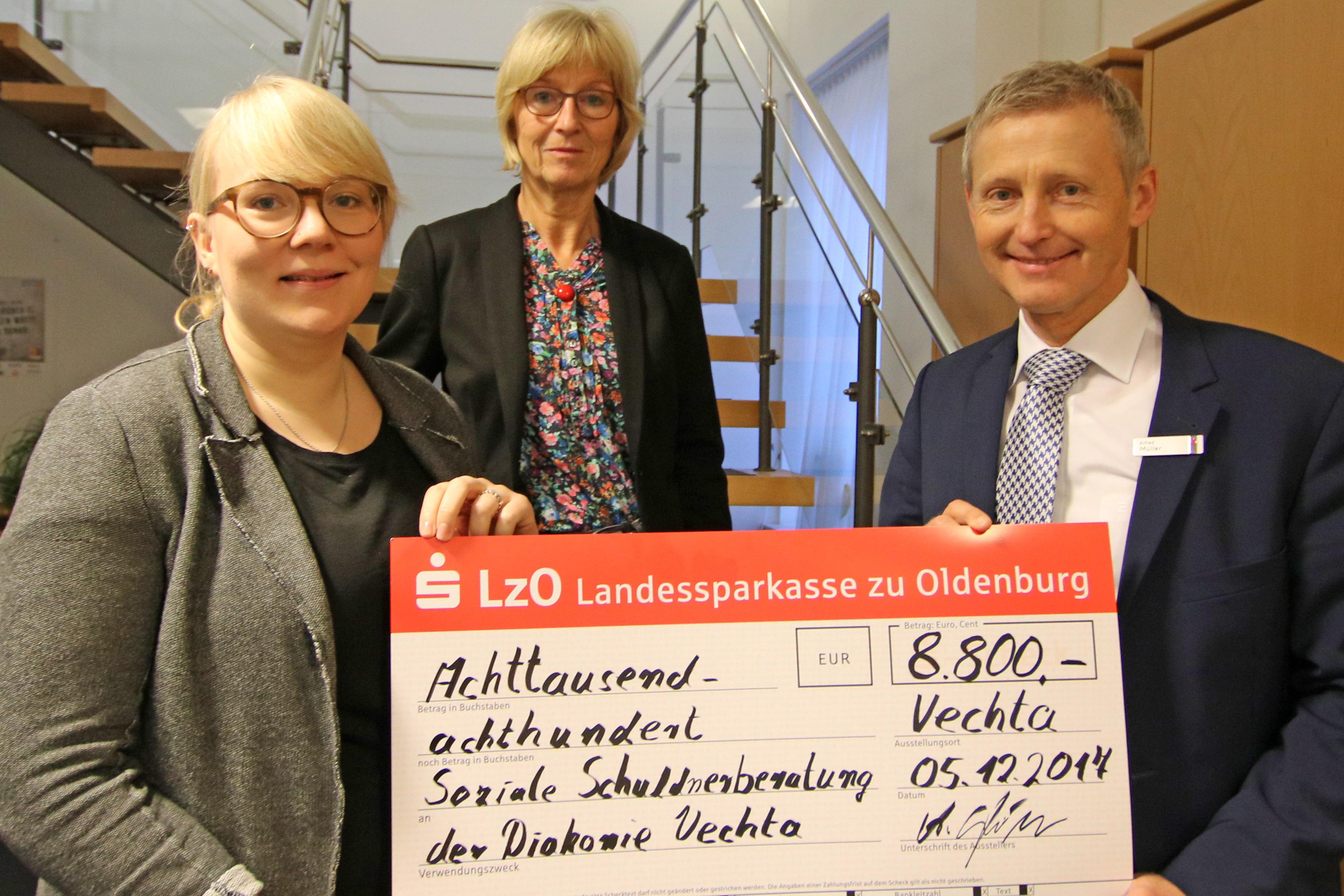 Vechta, 05.12.2017 – Franziska Mües und Margret Reiners-Homann von der Diakonie in Vechta danken der Landessparkasse zu Oldenburg für die Unterstützung der Schuldnerberatung in Vechta. Alfred Müller, LzO-Regionaldirektor Firmenkunden Vechta überreichte der Diakonie einen Förderscheck in Höhe von 8.800 Euro aus Mitteln des Lotteriespiels „Sparen + Gewinnen“. Der Sparkassenverband Niedersachsen unterstützt die Schuldnerberatungsstellen der Diakonie, damit sich Menschen an eine Beratungsstelle in ihrer Nähe wenden können. Überschuldete brauchen die Unterstützung einer vorurteilsfreien Beratung, betonte die Diakonie. Denn Überschuldung entsteht meist bei Einschnitten im Lebenslauf. Bei jedem Zweiten ist Arbeitslosigkeit ein Auslöser für Überschuldung. Auch Krankheit, Scheidung oder Trennung führen in die finanzielle Notlage. Fast jeder Zweite hat dann weniger als 900 Euro netto. Also weniger als das Existenzminimum, berichtet das statistische Bundesamt. In Vechta sind zahlreiche Familien in der Beratung, berichtet Franziska Mües, die wegen eines sehr geringen Arbeitseinkommens von um die 1.100 Euro in die Überschuldung geraten sind.